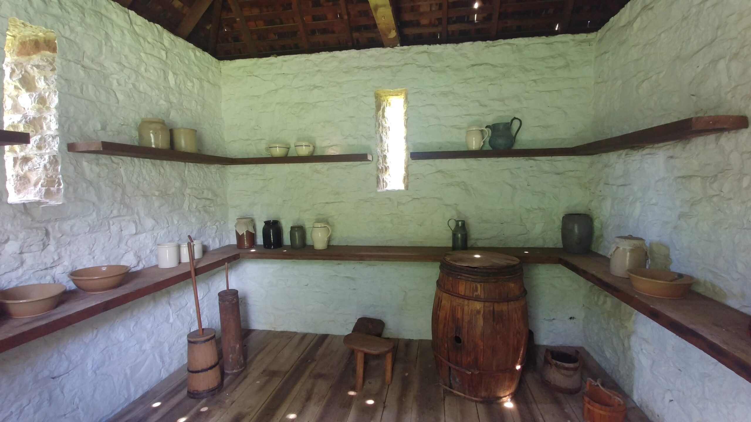 This building is reconstructed from stone and falls several feet below grade in order to encourage the cool temperatures necessary to work with dairy products. If possible, the temperature of a dairy was kept at least 10-15 degrees cooler than outside temperatures. (Ideally 50 degrees.)